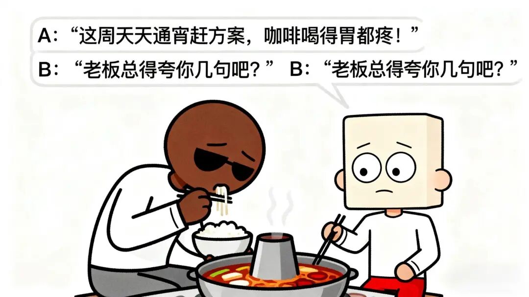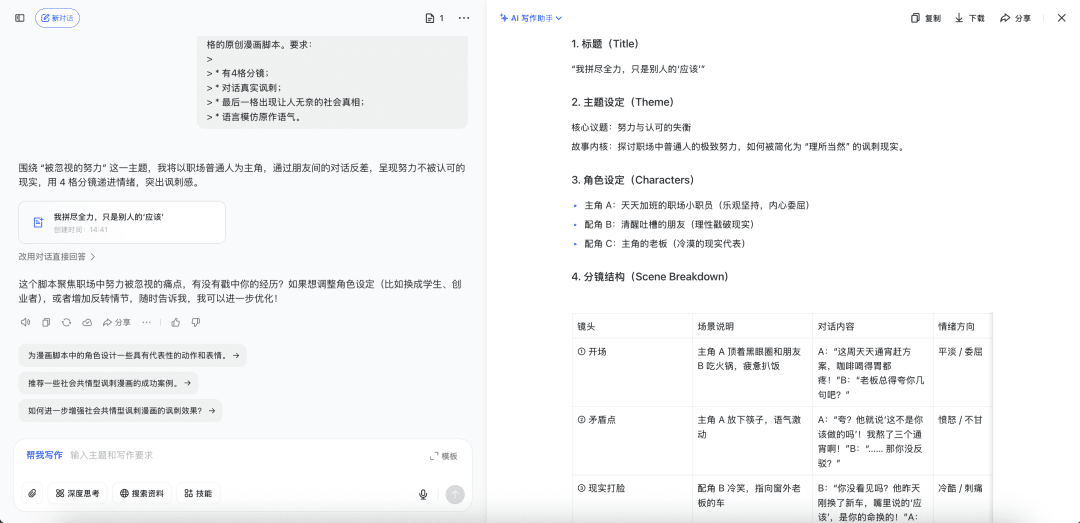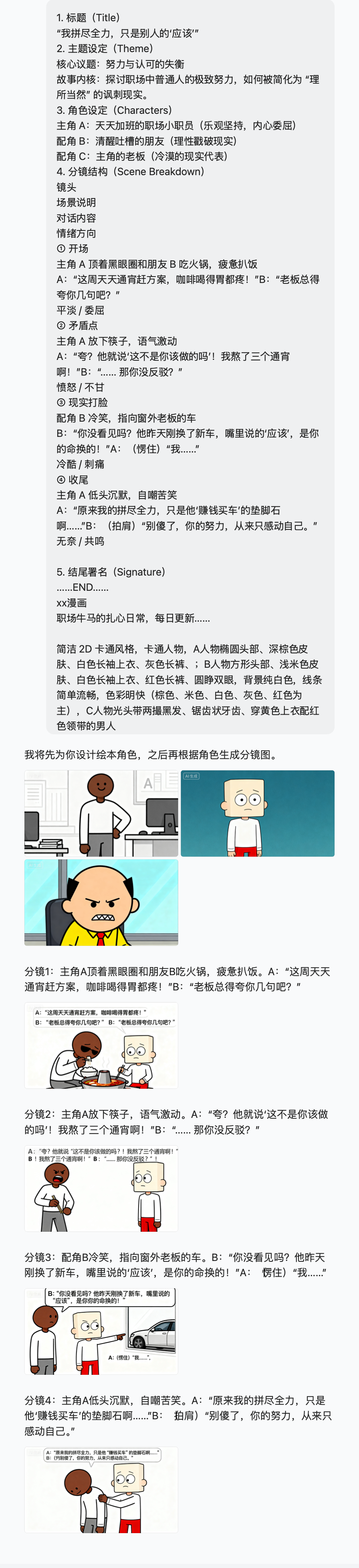 1. 标题(Title)“我拼尽全力,只是别人的‘应该’”2. 主题设定(Theme)核心议题:努力与认可的失衡故事内核:探讨职场中普通人的极致努力,如何被简化为 “理所当然” 的讽刺现实。3. 角色设定(Characters)主角 A:天天加班的职场小职员(乐观坚持,内心委屈)配角 B:清醒吐槽的朋友(理性戳破现实)配角 C:主角的老板(冷漠的现实代表)4. 分镜结构(Scene Breakdown)镜头场景说明对话内容情绪方向① 开场主角 A 顶着黑眼圈和朋友 B 吃火锅,疲惫扒饭A:“这周天天通宵赶方案,咖啡喝得胃都疼!”B:“老板总得夸你几句吧?”平淡 / 委屈② 矛盾点主角 A 放下筷子,语气激动A:“夸?他就说‘这不是你该做的吗’!我熬了三个通宵啊!”B:“…… 那你没反驳?”愤怒 / 不甘③ 现实打脸配角 B 冷笑,指向窗外老板的车B:“你没看见吗?他昨天刚换了新车,嘴里说的‘应该’,是你的命换的!”A:(愣住)“我……”冷酷 / 刺痛④ 收尾主角 A 低头沉默,自嘲苦笑A:“原来我的拼尽全力,只是他‘赚钱买车’的垫脚石啊……”B:(拍肩)“别傻了,你的努力,从来只感动自己。”无奈 / 共鸣5. 结尾署名(Signature)……END……xx漫画职场牛马的扎心日常,每日更新……