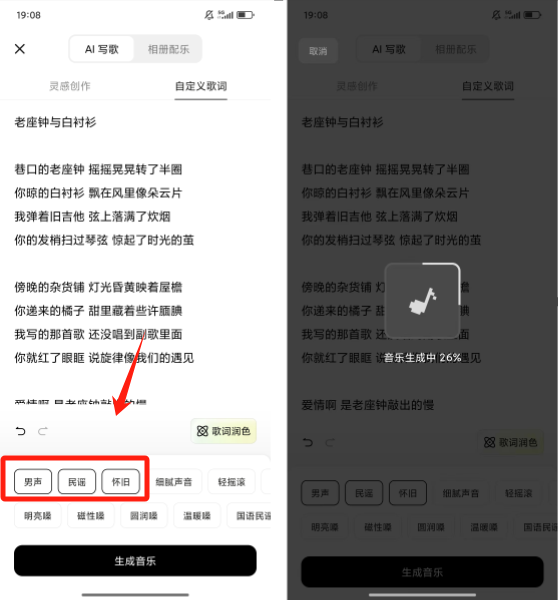 然后把生成好的歌词复制下来,然后利用海绵音乐生成。选择好声音和风格,点生成音乐等个几秒钟就弄好了