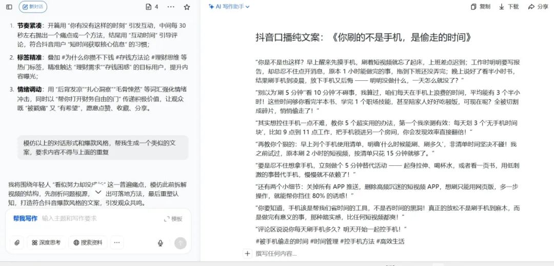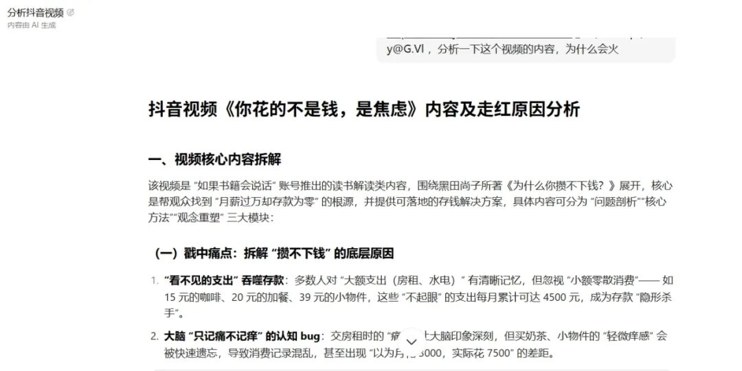 手把手教你AI流水线量产视频。把对标爆款链接丢给「豆包」,敲一行指令:“拆解视频爆点,生成同款访谈文案”,30秒白嫖一条带梗脚本。