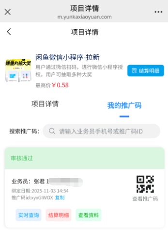 审核是秒过的,审核通过之后就能获取自己的推广码。