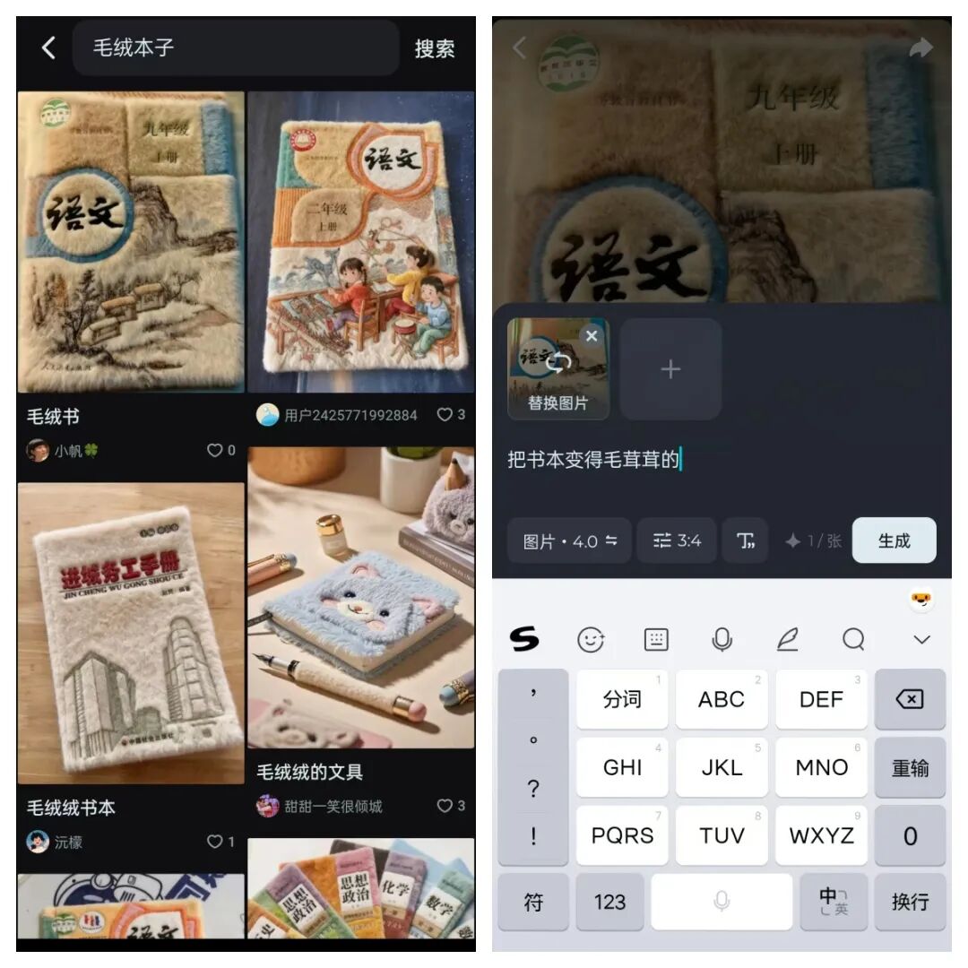 手机打开即梦,然后搜毛绒本子这个关键词,就可以看到很多别人做好的效果了,然后点做同款,上传你要做的封面图片,很快就可以生成和上面差不多的效果了。