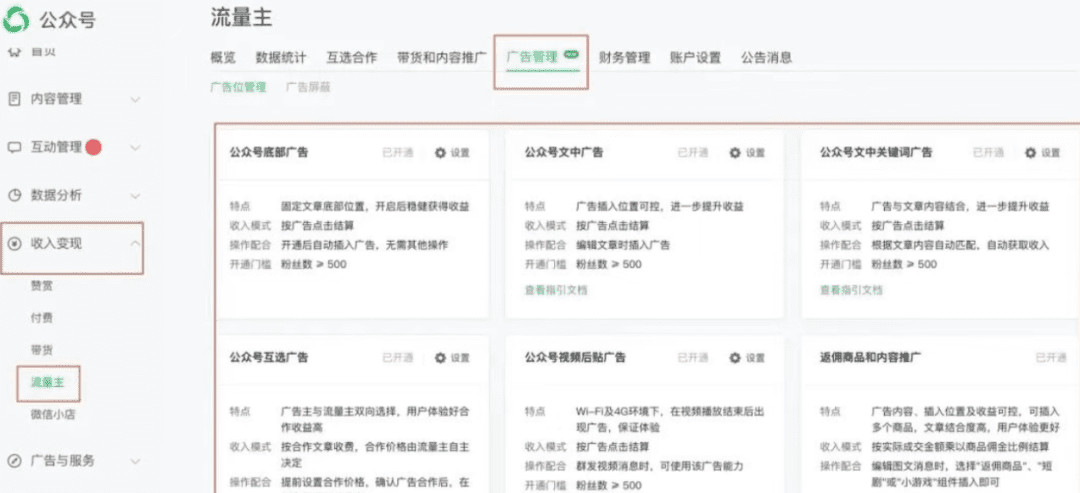 开通流量足最基本的条件就是公众号要有500个粉丝(前期可以养号到500粉丝)涨到500粉丝开通流量主之后,广告就会自动插入到你的文章里边了,正常来说800字左右会插入一个广告,1200字会插入两个广告。收益是和文章的阅读挂钩的。通常是由阅读,点击量和,广告展示时间来决定的吗,差不多一万次阅读是是在60—100之前