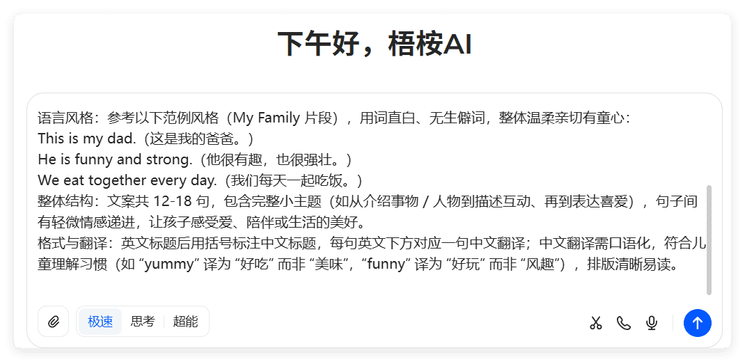 语言风格:参考以下范例风格(My Family 片段),用词直白、无生僻词,整体温柔亲切有童心: