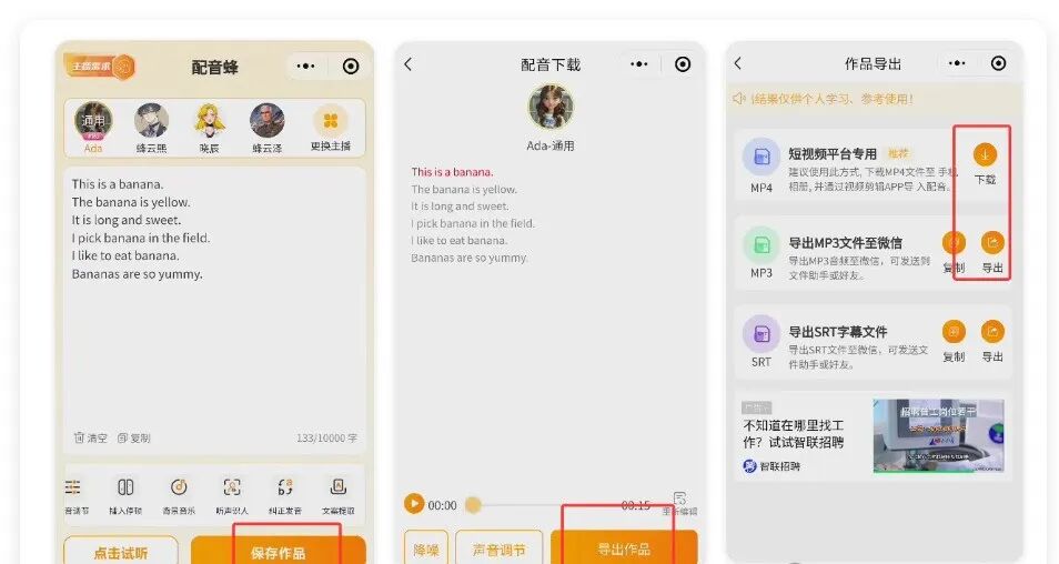 小程序搜“配音蜂”,输入豆包写的英文句子,主播-英文-Ada-这个音频;按照图片步骤操作导出(每天有免费额度,用完看广免费用)