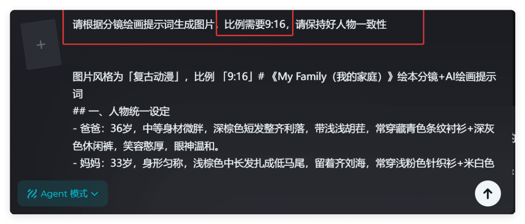1.复制上边的文案,添加一下提示词,在对话框输入提示词 (分镜画面提示词)