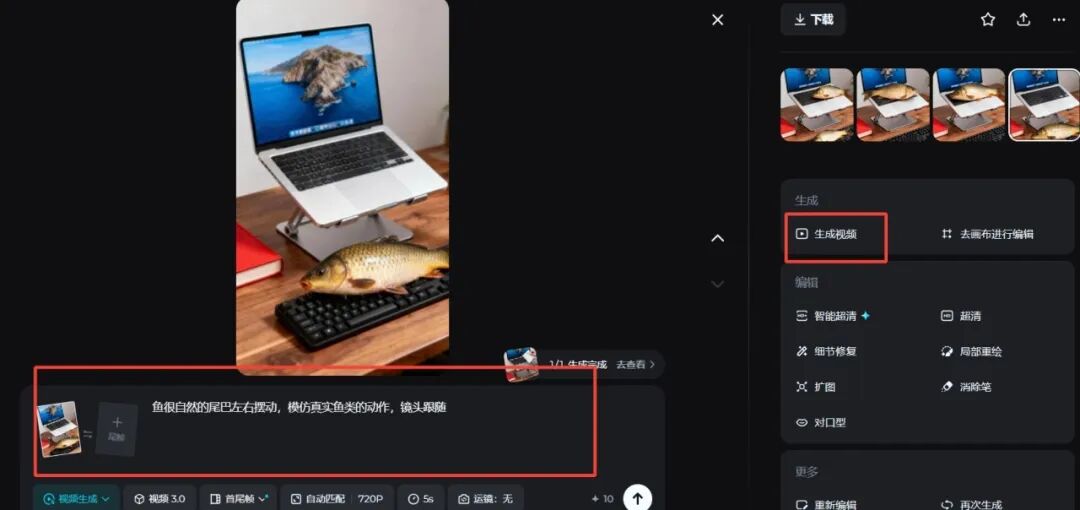 点开两幅神图各自戳“生成视频”,让即梦吐两段动态素材存进坦克库备用:
