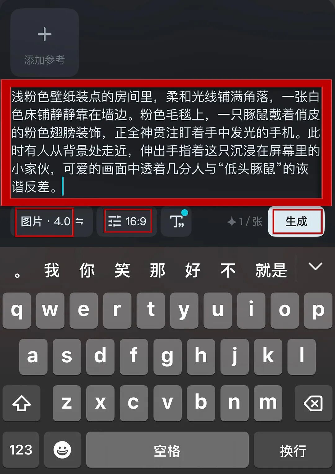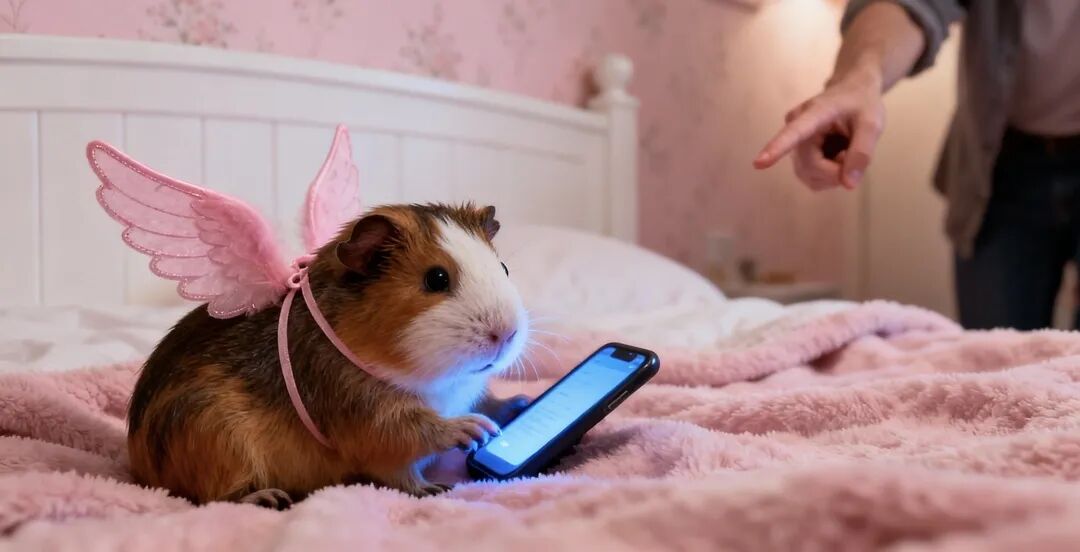 画面提示词:浅粉色壁纸装点的房间里,柔和光线铺满角落,一张白色床铺静静靠在墙边。粉色毛毯上,一只豚鼠戴着俏皮的粉色翅膀装饰,正全神贯注盯着手中发光的手机。此时有人从背景处走近,伸出手指着这只沉浸在屏幕里的小家伙,可爱的画面中透着几分人与“低头豚鼠”的诙谐反差。