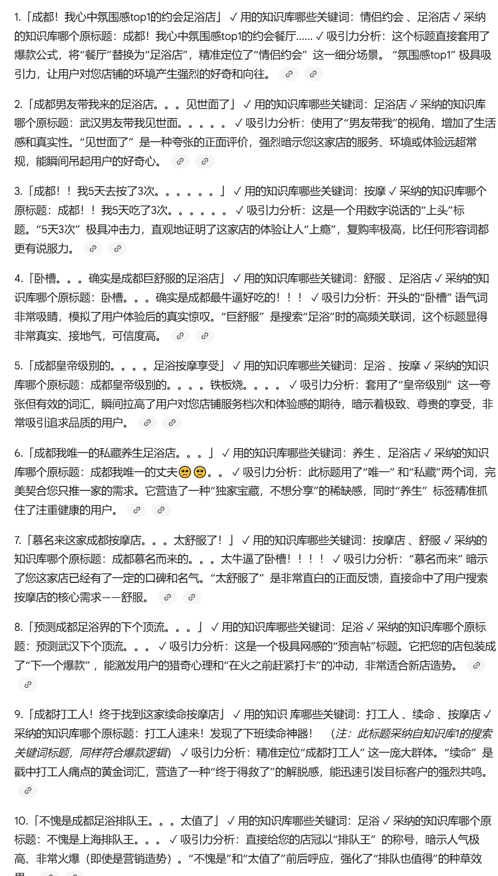 那上面我们可以发现你要做这个内容,标题要圈地区词,圈人群,要有业务词等等,那如果我现在要为成都的足浴店写标题,应该怎么写,这个在几个月前我在陪跑课程里讲过一个技巧,就可以做个智能体来解决。
