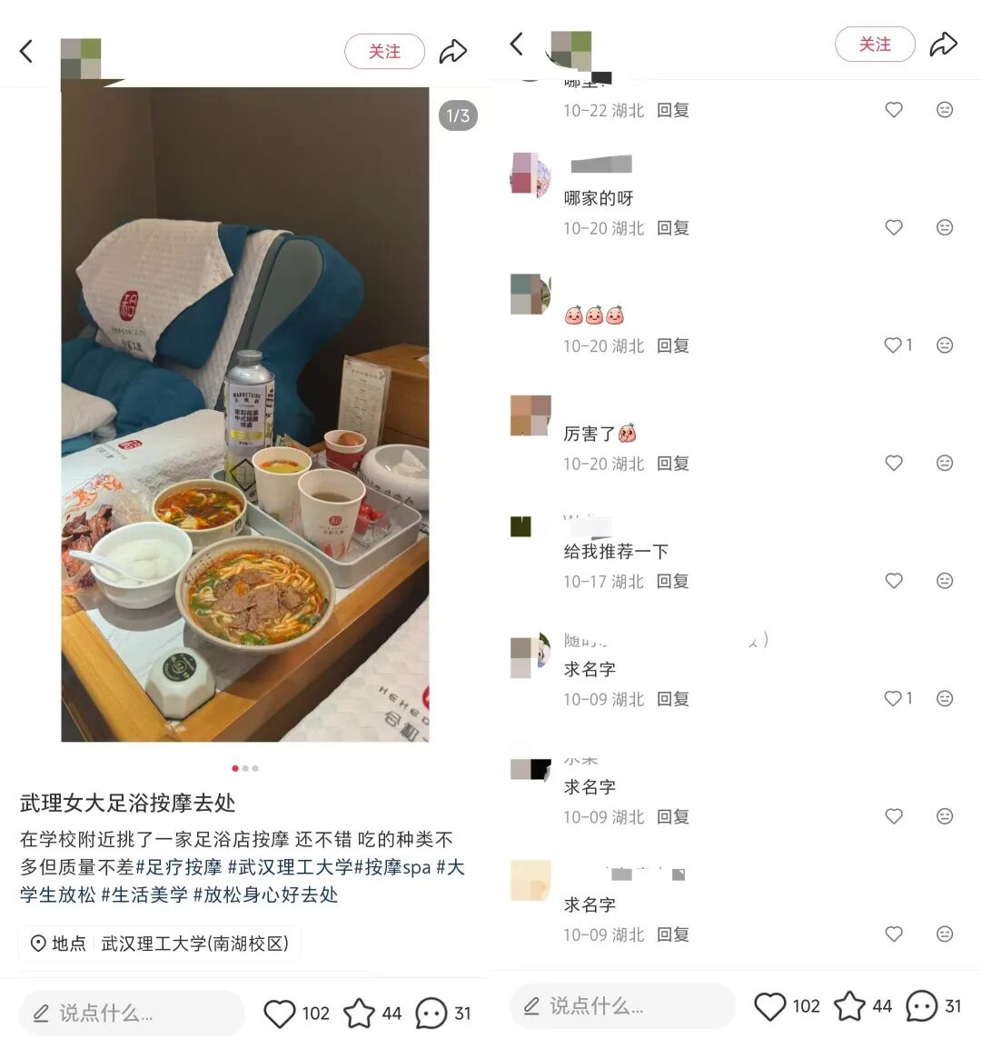 那有的朋友就说了,我这足浴店就是比较普通的,没有所谓的帅哥那咋么办,毕竟大部分门店是请不起这样的人的,成本太高了,没有那就从美食来切入,下面这个笔记就是主打美食这个卖点,加上圈了大学生人群,主打一个平价。
