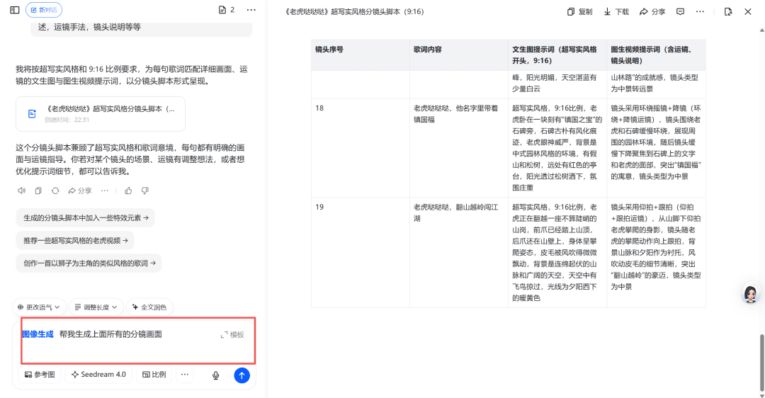 继续输入提示词:针对上面的歌词生成对应的分镜头脚本,