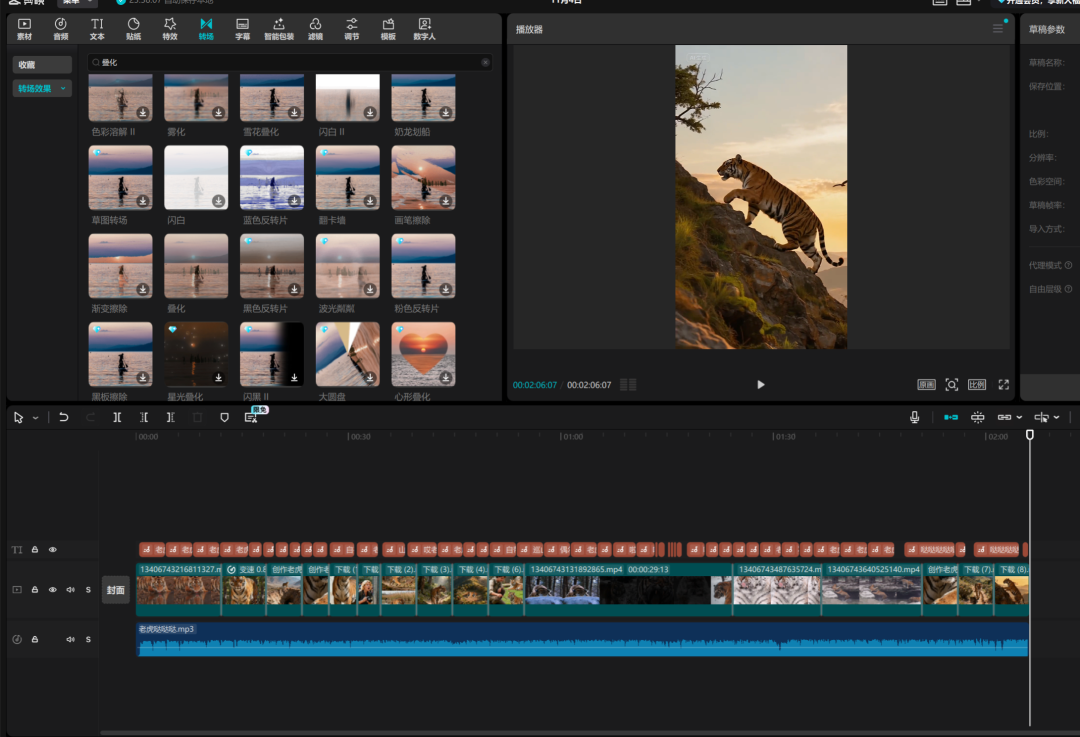 3.打开剪映导入生成的所有视频片段和音频,拖入轨道对齐,视频画面添加合适叠化转场识别歌词,设置歌词字幕的颜色,字体