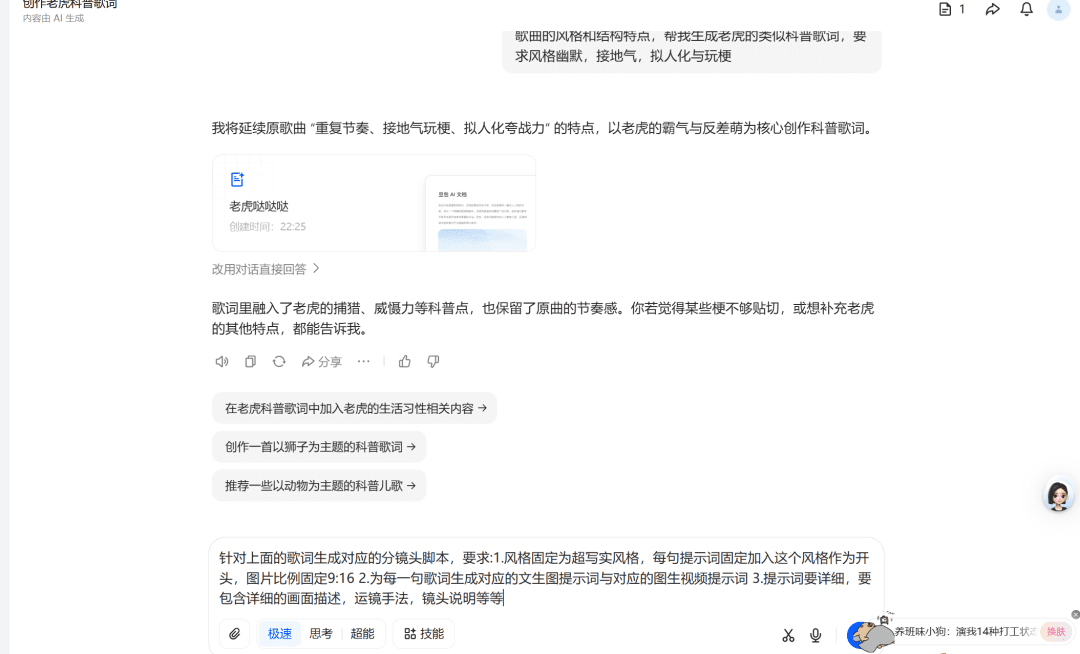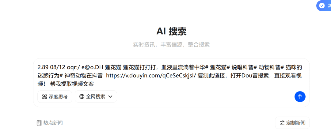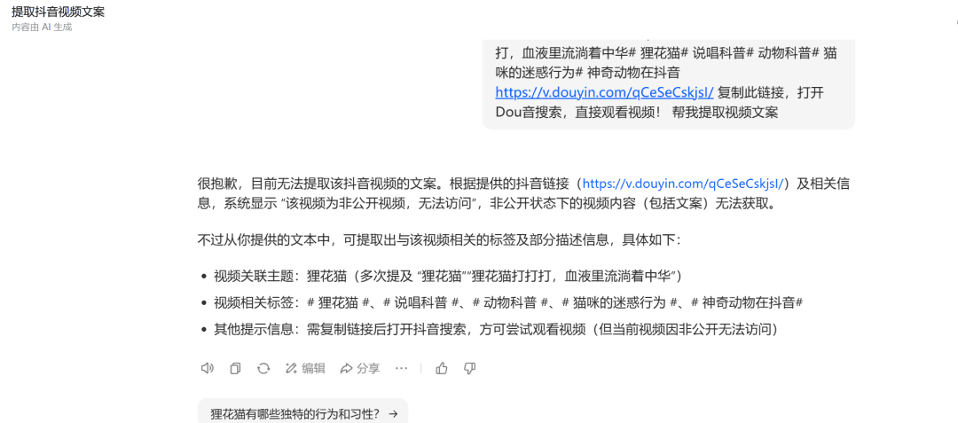 实战教程1.文案生成提示词生成常用kimi、deepseek、claude、chatgpt或者豆包等等工具进行生成,这边我使用deepseek网址:https://www.doubao.com/chat/search把对标视频链接扔给豆包提取完整的视频文案