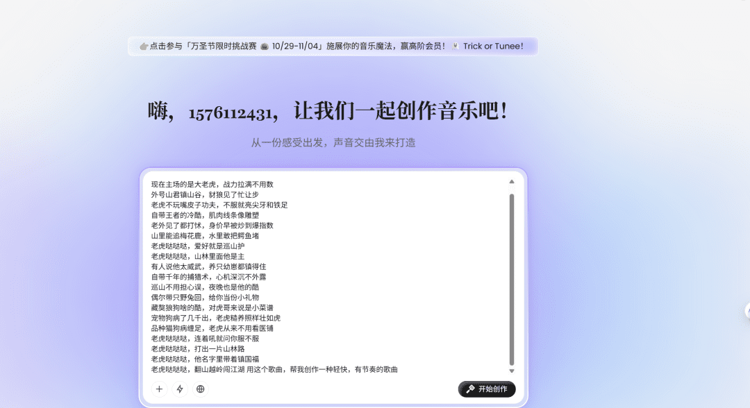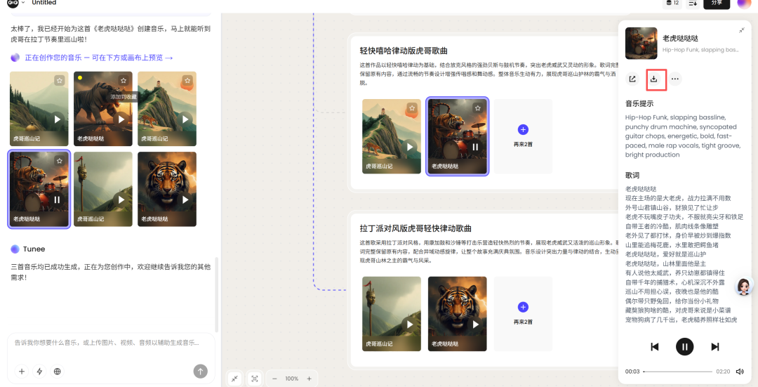 按照这个方式把所有画面全部转场视频下载到本地备用ps:素材可以自已网上搜索进行下载或者借助ai来生成2.音乐生成生成音乐选择suno或者tunee,这边推荐使用tunee制作就可以,它无需魔法,对于小白比较友好网址:https://www.tunee.ai/zh-CN/home输入豆包生成歌词让tunee进行歌曲创作