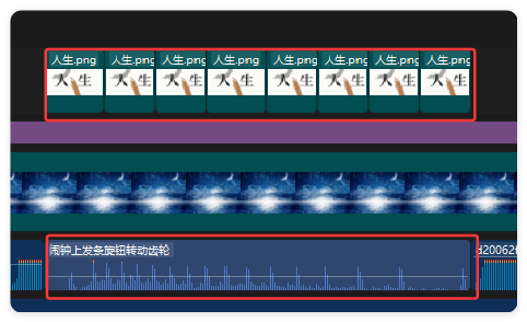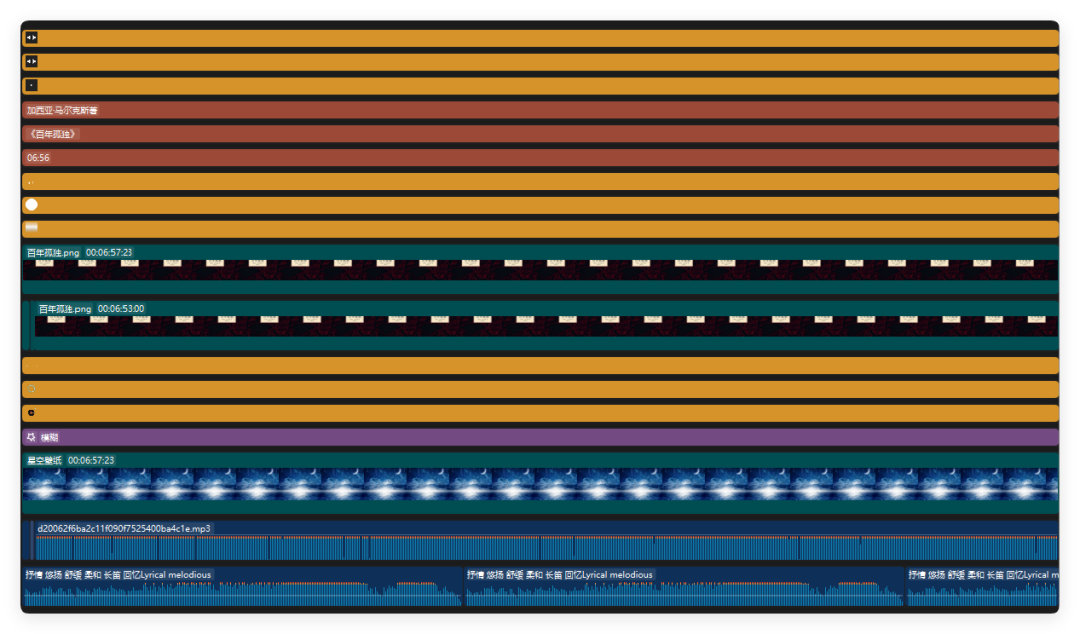 10.添加一个轻音乐,整体剪辑轨道大概是这样的,模板只做一次,后续替换书籍封面和音频即可,