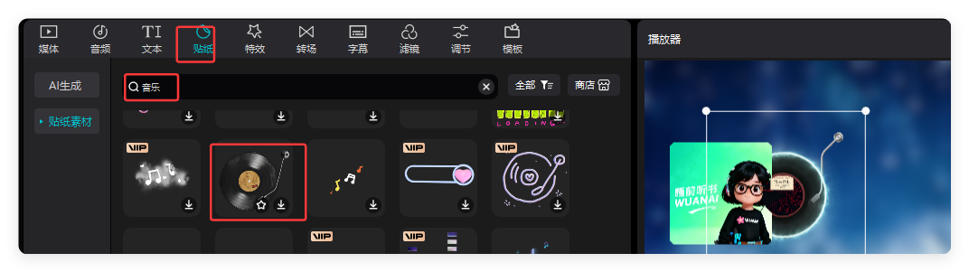 8.添加贴纸,搜播放,找到其他贴纸几个贴纸
