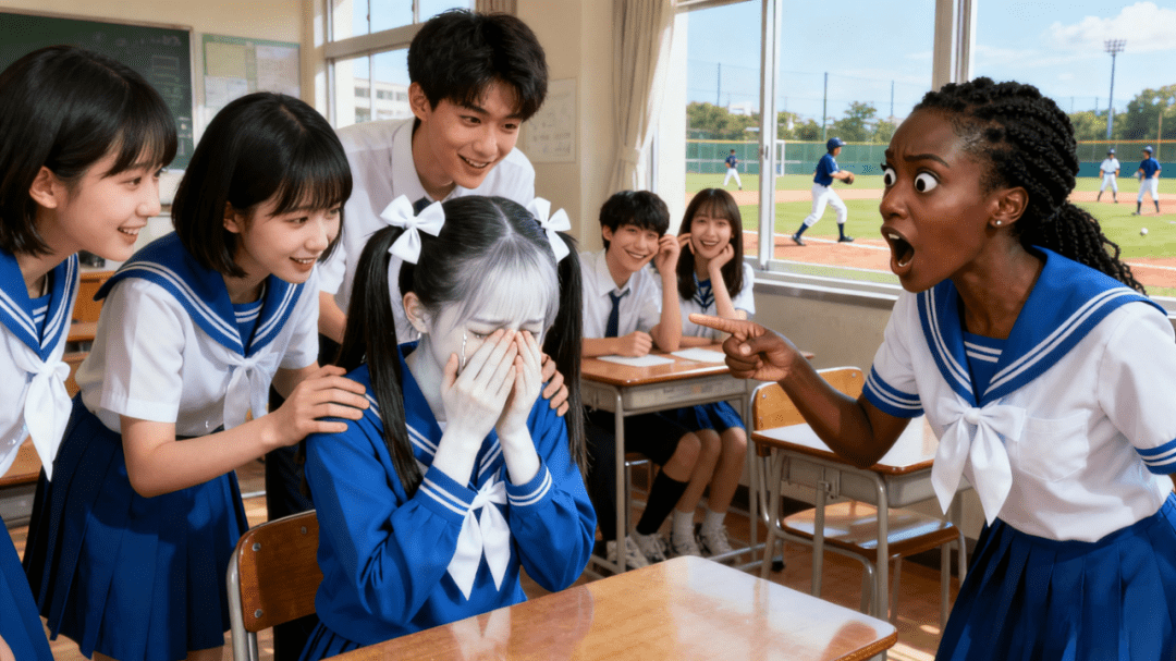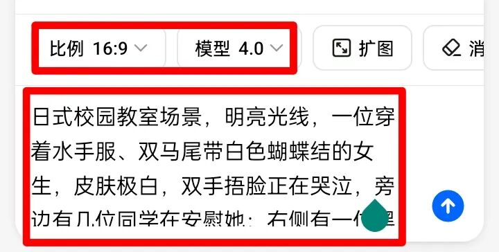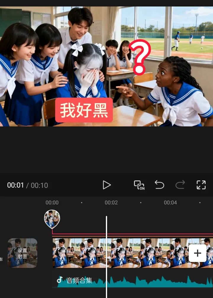 一、生成AI图像—打开豆包APP—进入“AI生成”功能—输入详细提示词—选择比例为16:9,模型4.0日式校园教室场景,明亮光线,一位穿着水手服、双马尾带白色蝴蝶结的女生,皮肤极白,双手捂脸正在哭泣,旁边有几位同学在安慰她;右侧有一位黑人女性,手指向女生,表情夸张震惊不解;后面有同学笑,窗外有学生活动,整体风格是写实风,突出搞笑反差。—生成多组图像,挑选符合的画面