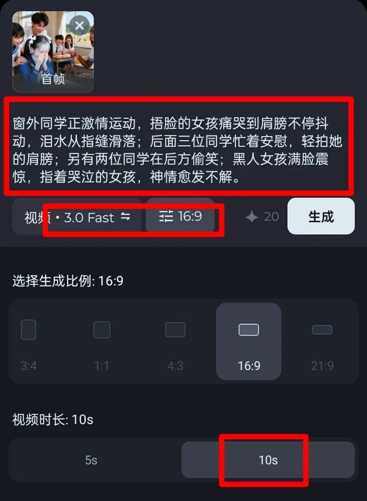 二、生成作品—打开即梦AI—选择作品生成—作品3.0fast模式,比例为16:9,时长10s—输入动作提示词,让人物动起来窗外同学正激情运动,捂脸的女孩痛哭到肩膀不停抖动,泪水从指缝滑落;后面三位同学忙着安慰,轻拍她的肩膀;另有两位同学在后方偷笑;黑人女孩满脸震惊,指着哭泣的女孩,神情愈发不解。