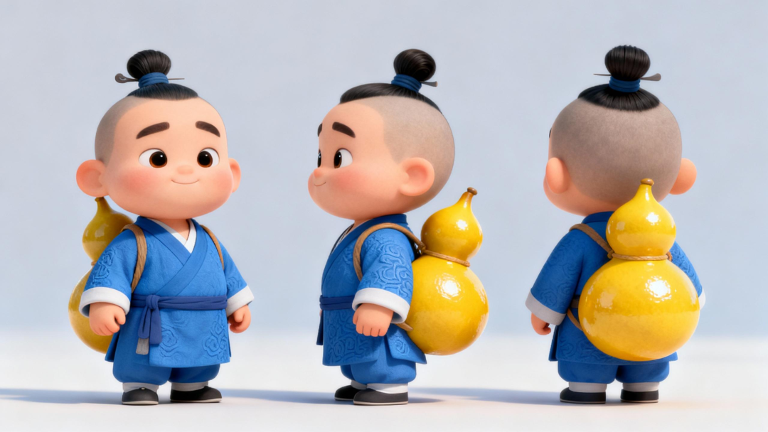 3. 图生视频拿到人物形象以后,我们就可以直接用来生视频了依然是用即梦图生视频,模型3.0,主题参考提示词自己随便写比如:背着黄色大葫芦的古代小道童走在森林里,轻松愉快,镜头从后背环绕到前面。非常治愈。8K超高清分辨率,Blender渲染,三点打光,高光柔和,阴影过渡自然