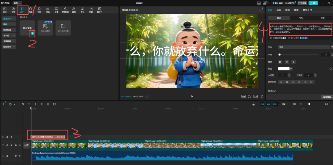 得到下面的视频根据你文案的长度,可以多生成几个视频,保存下来备用4. 视频剪辑将你生成的视频全部导入剪映,添加个背景音乐然后添加文本,将【生活文案大师】智能体生成的文案粘贴进来