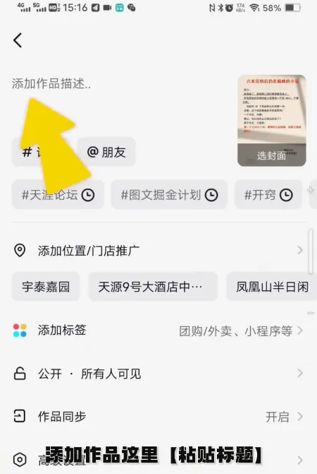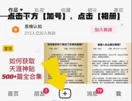 第三步发布视频:打开抖音点”+”号,从相册选刚下的视频,配上推荐音乐,粘贴刚才复制的标题,直接发布