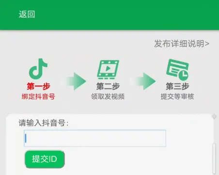 第一步绑定账号:打开软件点”立即开始”,进入抖音”我的”页面,复制你的抖音号(注意不是手机号),把抖音号粘贴到平台提交