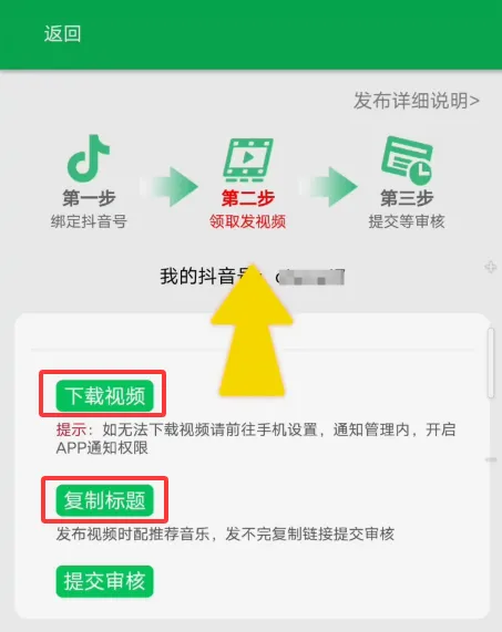 第二步领取视频:点击下载视频(会自动保存到相册),顺手把视频标题复制好
