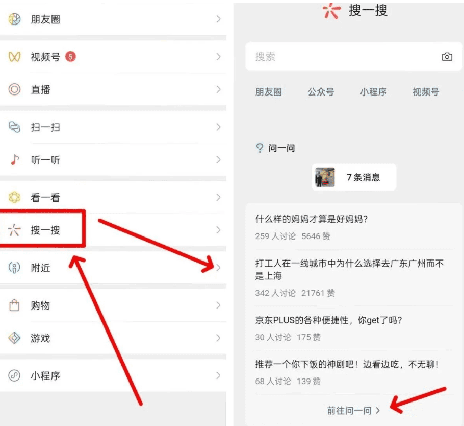打开微信到发现,点搜一搜进入,往下找到“前往问一问”,