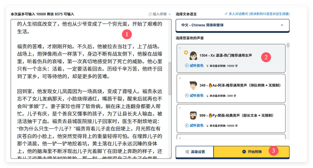 3.输入文案,配音蜂比较牛的是一次支持10000字,剪映只能支持500字朗读文本,这点比较省心,不用分割文案了