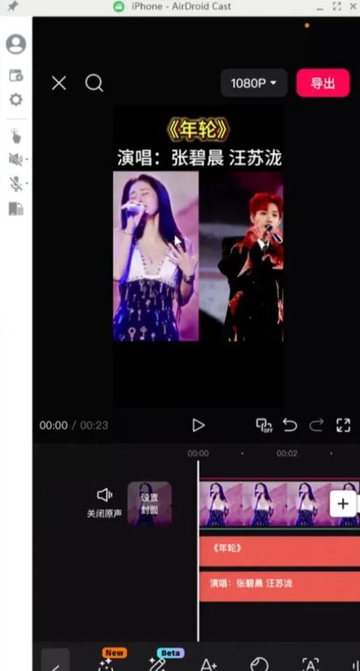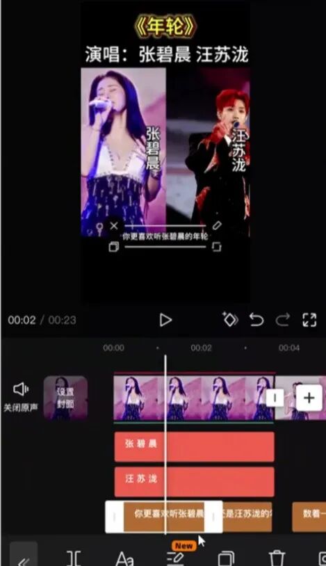 5. 从下载的两段演唱视频里,各自截取同一句歌词的部分(比如都唱副歌那一段),拼接在一起6. 添加歌曲名字作为标题,可以改改字体、颜色,让它更显眼