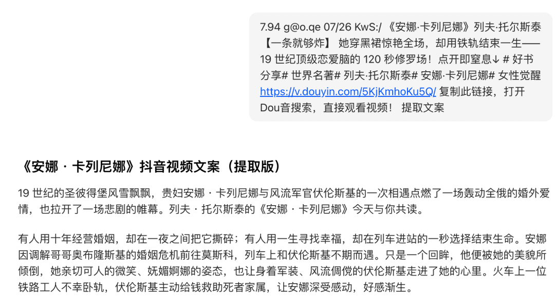 因为这些名著都是厚厚的一大本,现代人的生活节奏非常快,基本不会有时间读完一本名著,所以这也就让这一类型的短视频能够持续的火热。 下面就跟随我的脚步,来看看这类视频的制作方法! 第一步:生成文案 大家先找到自己要对标的视频,复制链接,然后将链接扔给豆包,后面再告诉豆包:提取文案!如下图所示: