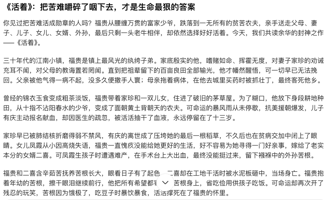 替换指令中的XXX,第一个是书名,最后的XXX是爆款文案,我今天以余华的《活着》为例给大家拆解。