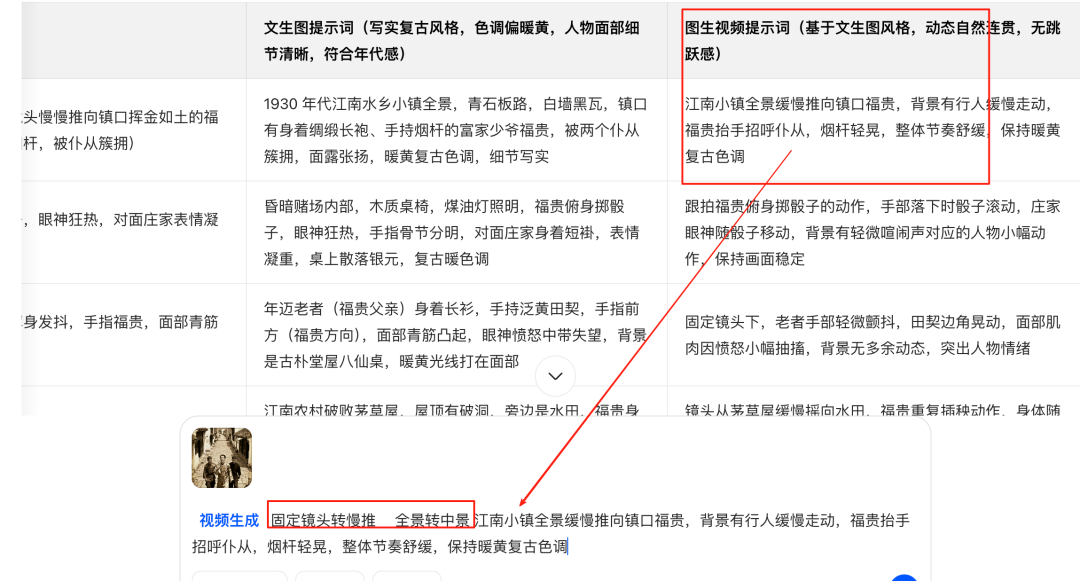 第四步:生成视频 刚才我们生成分镜头脚本的时候,已经让豆包给我们生成了运镜,景别和图生视频提示词,现在每个分镜头也有了图片,下面就是让豆包给我们将图片,运镜,景别和图生视频提示词整合起来,生成视频就行了。 不过我们看对标视频都是图片,也没有用视频呈现,所以大家也可以直接用上一步的图片,不过我本着负责的态度,给大家介绍一下生成视频的方法。 点击图片,放大到右侧显示区,然后点击右上角的生成视频按钮,然后复制表格内的运镜,景别和图生视频提示词,黏贴到视频生成区的文本库内,如下图所示,最后点击右下角的小箭头等待生成视频。