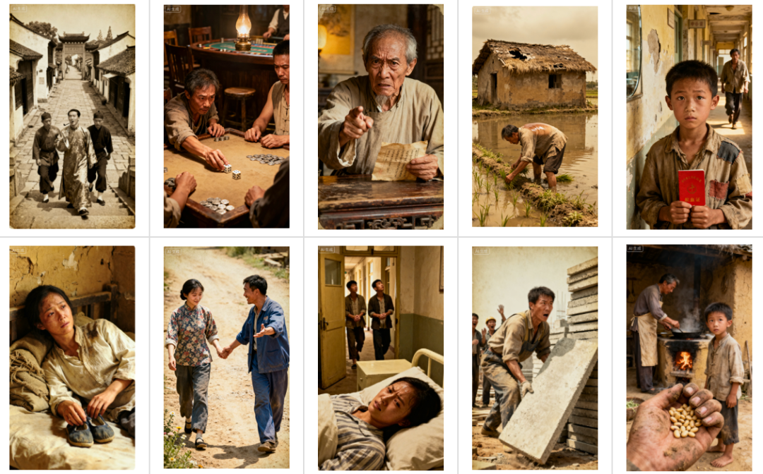 | 请根据分镜头脚本中的文生图提示词,帮我生成对应的图片,图片风格采用写实复古纪实风格,以暖黄+土黄+浅棕色调为主,模拟旧照片或者老电影的质感,无过度美化,前后风格保持一致,人物形象一致,符合年代感。图片比例为9:16. |