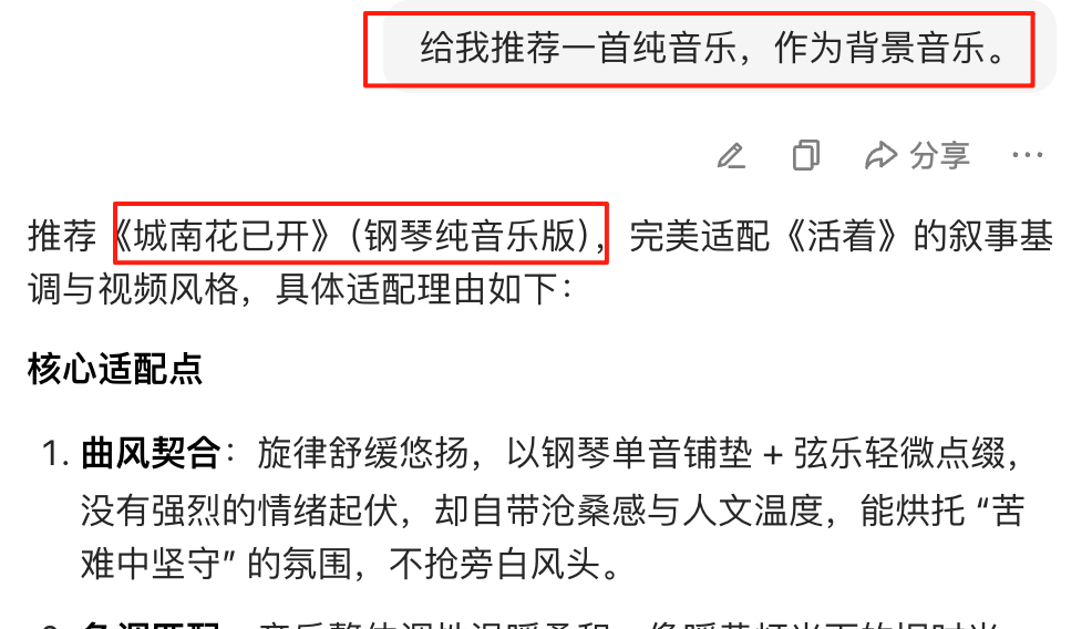后面的图片生成视频的方式都是一样的,大家耐心点,一个一个的生成就可以了,所有视频都生成好之后,就将视频的无水印版本下载下来,忘记怎么下载无水印版本的小伙伴可以去下面的文章里面看看,包括豆包的,即梦的,手机版和电脑版。 100%免费!AI视频去水印方法,建议收藏!以免找不到了! 第五步:剪映剪辑成片 大家将生成好的图片或者视频导入到剪映里面,按照顺序添加到主轨道内,然后添加一首符合书本内容的音乐作为背景音乐,如果不知道选择什么音乐,也可以问问豆包。比如豆包就给我推荐《城南花已开》,下面就可以再剪映里面搜索这首音乐。