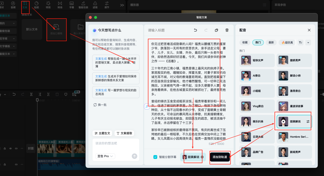 然后给每段视频添加转场,比如我喜欢用叠化,这个过度没有那么生硬,比较自然。 下面给视频添加文案和音频,大家可以用MiniMax生成音频,这个工具可以自己设计音色,不会的可以看看下面这篇文章。免费,音色设计的王者!带你全面体验如何设计高质量的音色! 也可以使用剪映自带的口播功能,如下图所示,大家按照箭头的顺序添加即可,其中音色大家可以试听一下,选择适合自己的音色。
