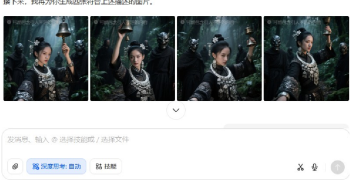 在充满神秘氛围的茂密丛林场景中,⼀位⾝着⿊⾊苗疆华丽传统服饰的东⽅⼥⼦为核⼼主体。⾼颜值少⼥、⾯容精致、垂眸、邪魅表情。她梳着古典发髻,头上插着银饰的⼩花与精致的银饰发簪,佩戴繁复且精美的银质项链、⽿饰等配饰,⾐袍有细腻花纹与光泽。她右