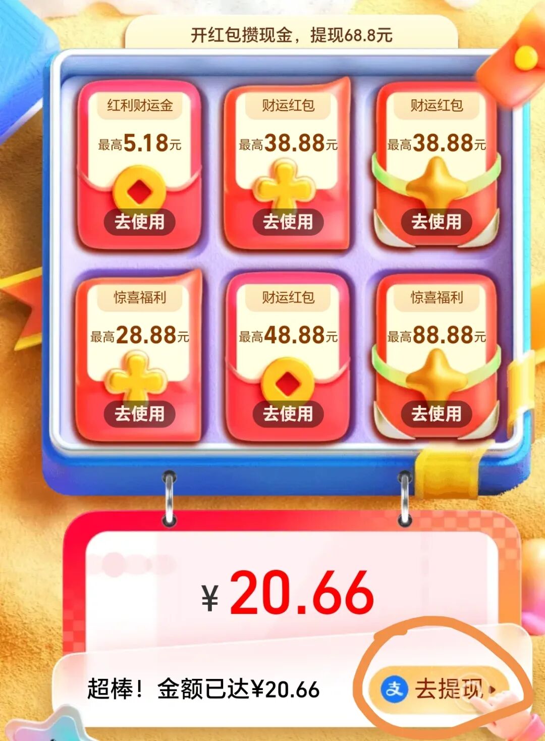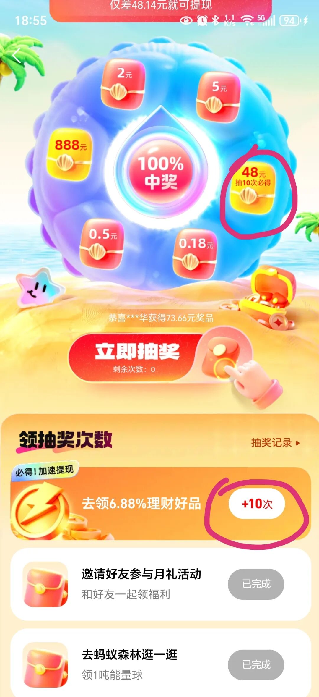 这上面可以抽奖,抽奖次数可以按照官方要求完成下发小任务获取,重点在于有一个任务可以+10次抽奖,抽10次必得48元,加上刚刚开出的20元,完全可以满足68.8元提现。