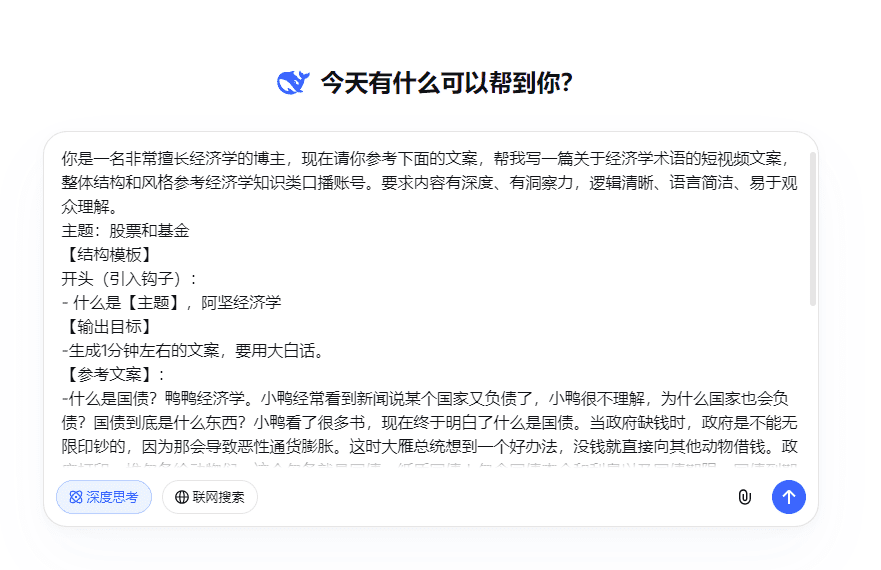 ①打开DeepSeek,输入提示词:你是一名非常擅长经济学的博主,现在请你参考下面的文案,帮我写一篇关于经济学术语的短视频文案,整体结构和风格参考经济学知识类口播账号。要求内容有深度、有洞察力,逻辑清晰、语言简洁、易于观众理解。