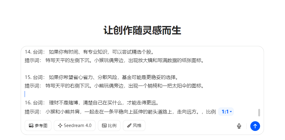 1.打开豆包,选择图像生成,粘贴分镜提示词,模型选择4.0,比例选择1:1,点击生成。