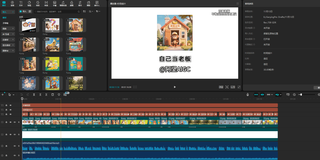 识别字幕,添加背景音乐与音效,调整节奏后导出。