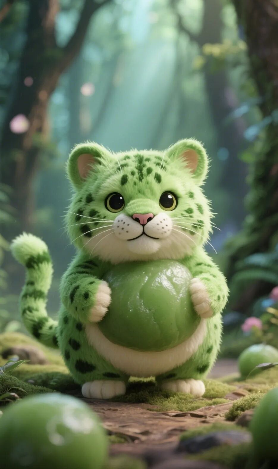 画面提示词:美洲狮和青团杂交生成的可爱生物,整体为美洲狮的形态,体型短小可爱,圆滚滚的,胖胖的身体,呆萌