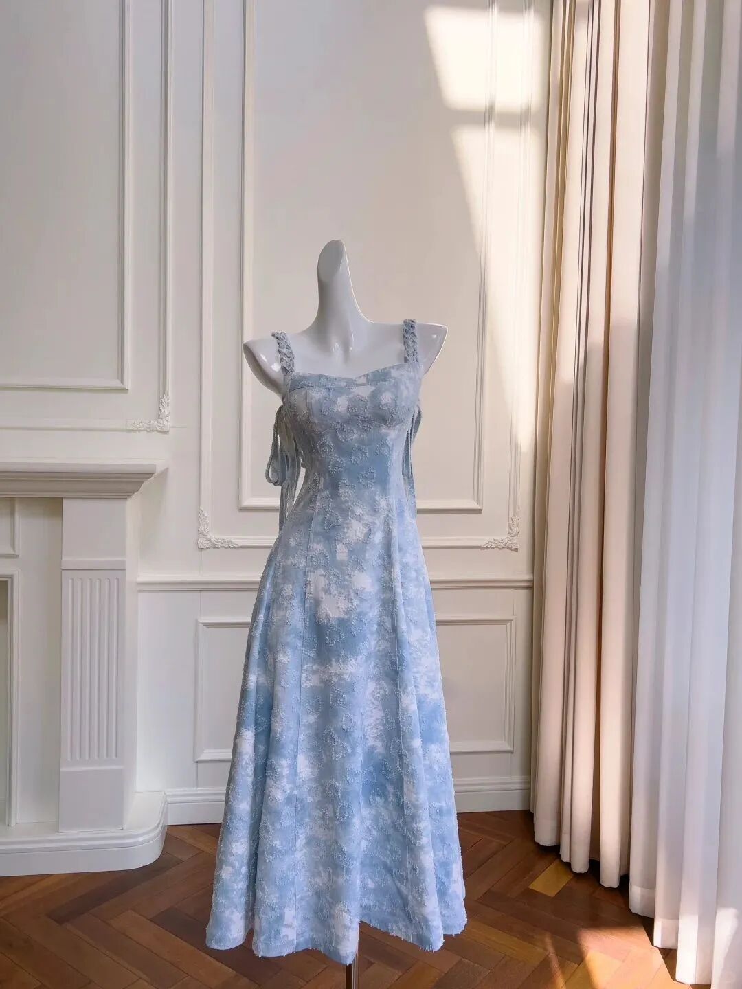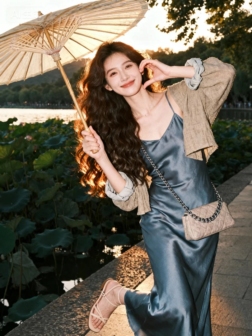 生活化快照风格,非精心摆拍,极致三围比,上围饱满,冷白皮白皙透亮,亚洲美女置身其中。留着深棕色大波浪卷发,身着莫兰迪色系雾霾蓝缎面吊带长裙,外搭一件宽松亚麻材质短款开衫(袖口随意卷起),脚踩裸色细带凉鞋,背着限量款链条包。