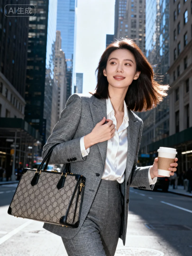 职场精英风格,日常快拍无刻意打光,极致三围比,上围饱满,冷白皮通透细腻,亚洲美女身处其中。留着深棕干练锁骨发,身着灰色格纹西装套装(内搭白色真丝衬衫),手提大牌公文包。