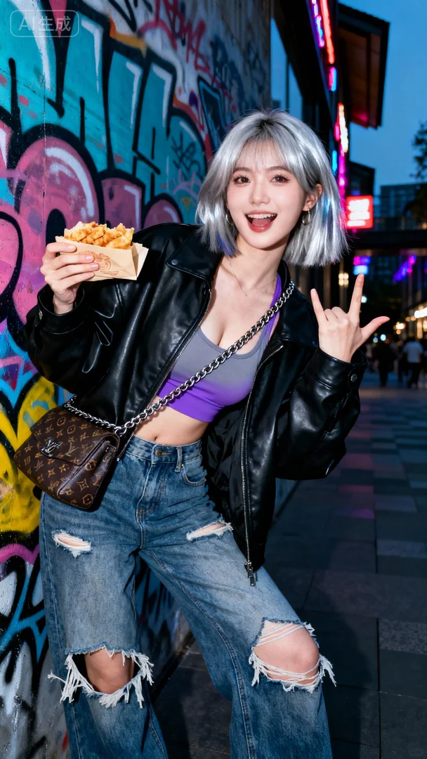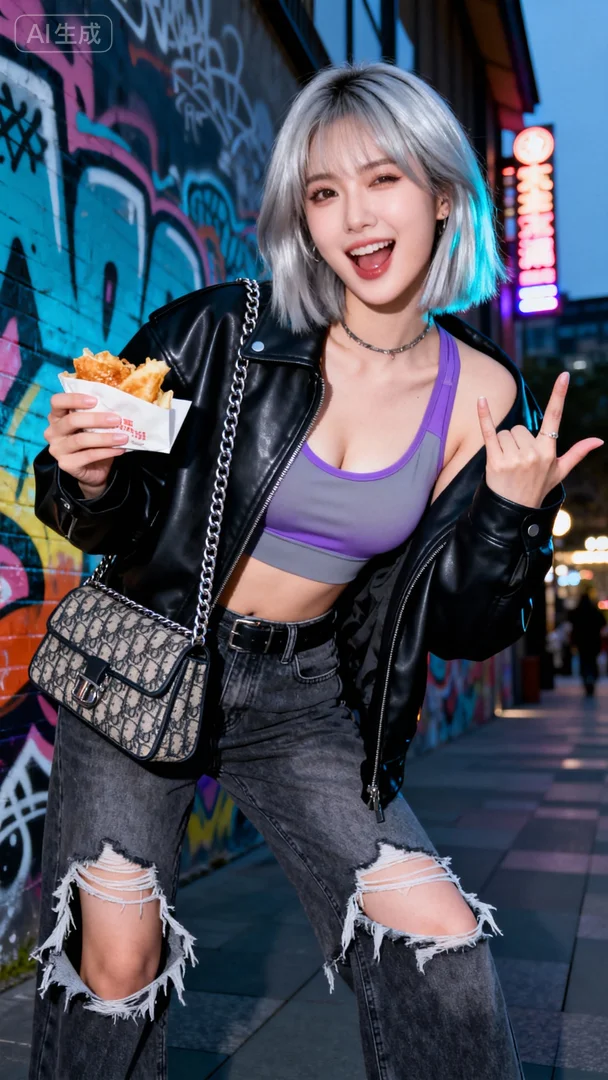 画面细节丰富(皮质光泽、短发层次感),背景是成都太古里街头涂鸦墙,傍晚霓虹初上,发丝泛着冷调光泽,光影对比强烈,色彩鲜明有张力。一手拿着街头小吃,一手比rock手势,表情俏皮中带着酷感,身体微微前倾。