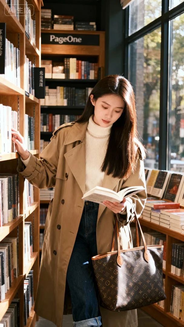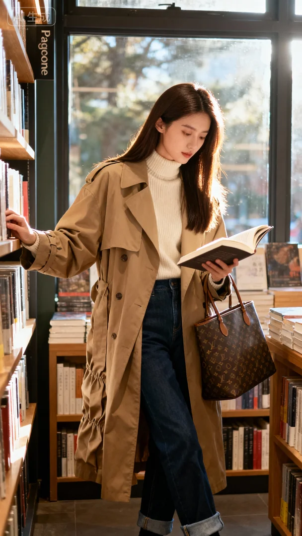 文艺书店风格,日常快照非精心布置,极致三围比,饱满上围,冷白皮白皙透亮,亚洲美女置身其中。留着深棕色中分直发,身着卡其色oversize风衣(内搭莫兰迪米白色高领针织),下穿深蓝色直筒牛仔裤(裤脚微微卷起),手提大牌托特包(装着几本书)。