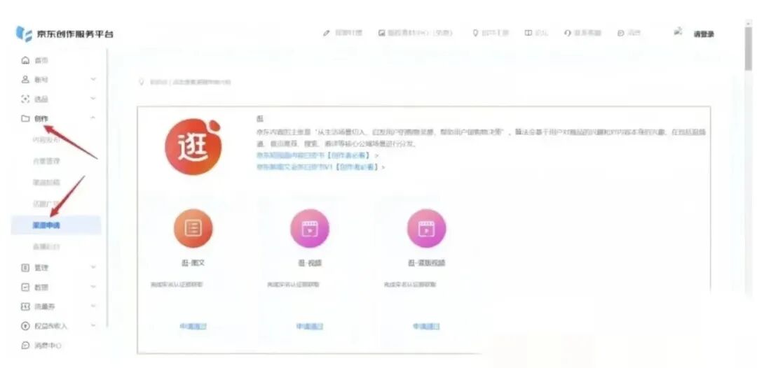 2、打开带货权限点击创作栏,下方有个渠道申请,有三个选项,选择好相应渠道后开通