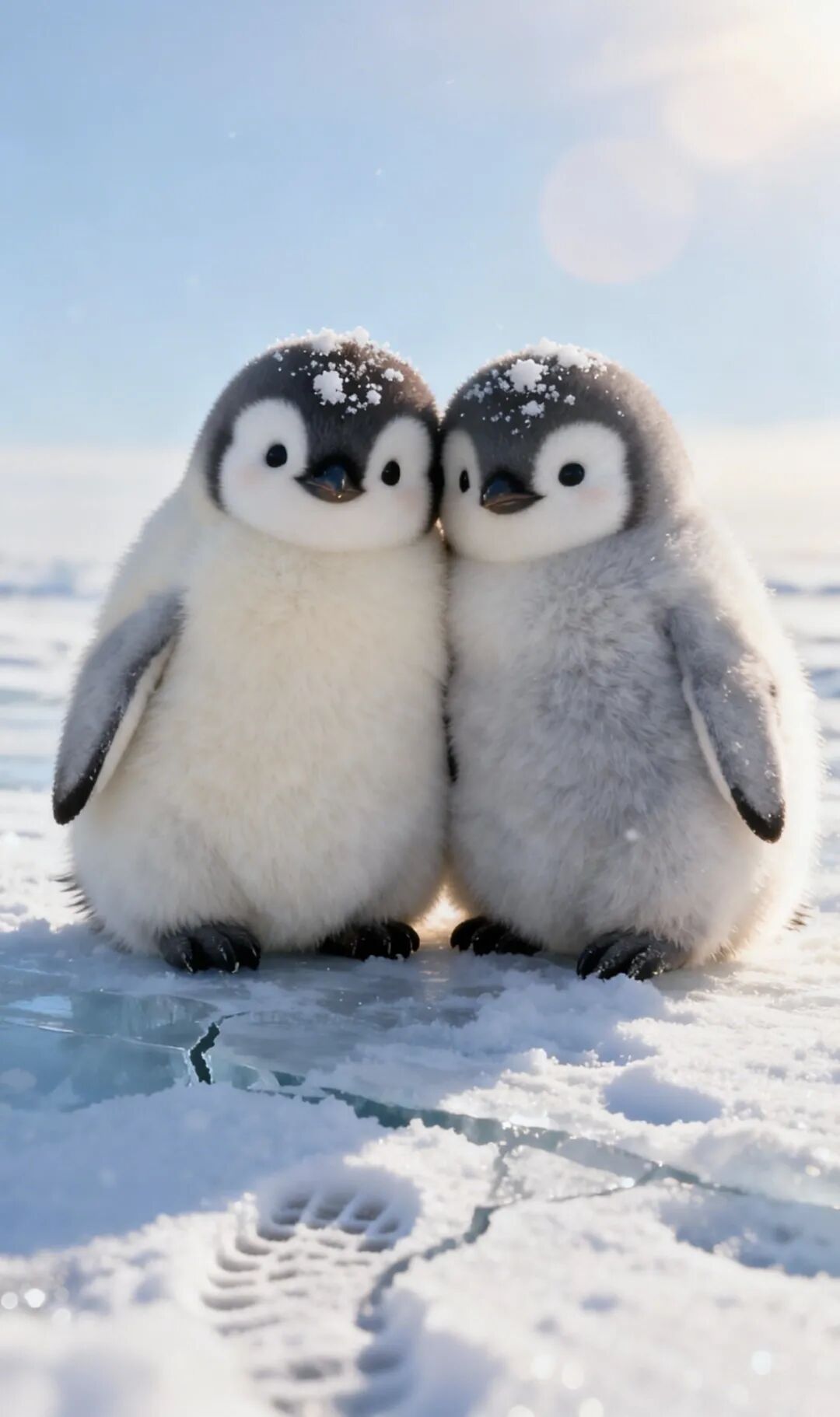 画面提示词:两只胖乎乎的企鹅幼崽,绒毛呈奶白色+浅灰色渐变,蓬松得像棉花糖,亲密靠坐在冰雪地面上,小短鳍互相搭着,头顶落着零星雪花,雪地有自然脚印与冰裂纹,背景是淡蓝色天空,阳光洒下形成柔和光斑,写实向+可爱风结合,8K高清