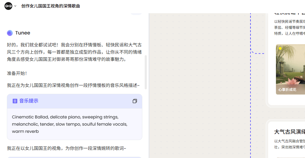 1. 音乐用当前大火的音乐制作软件—tunee网址:https://www.tunee.ai/zh-CN/home每天都有免费的额度,一天大概可以生成15首歌曲进入网站以后,直接输入提示词: