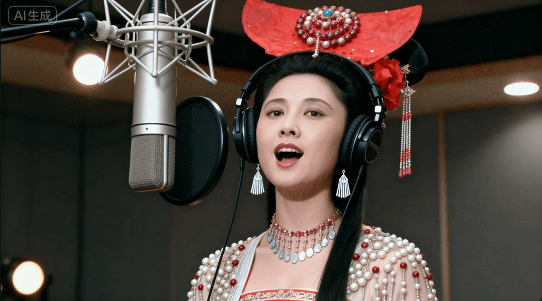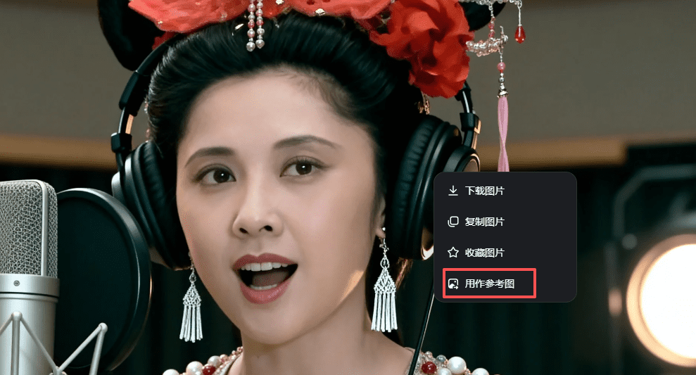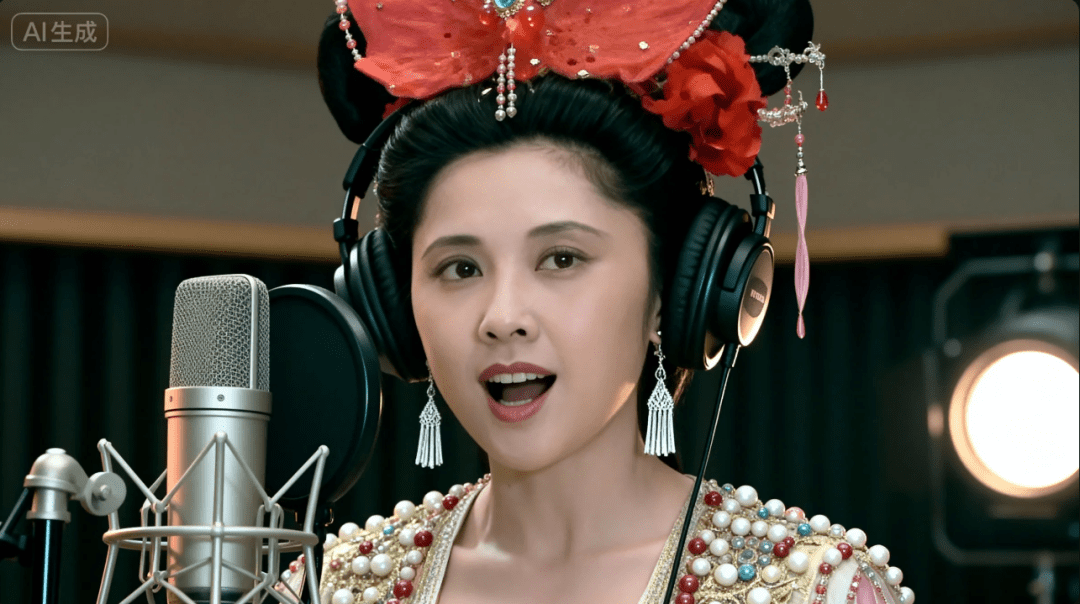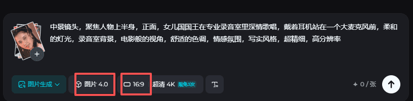 打开即梦,图片生成,模型4.0,比例16:9上传这三张图,写上提示词:中景镜头,聚焦人物上半身,正面,女儿国国王在专业录音室里深情歌唱,戴着耳机站在一个大麦克风前,柔和的灯光,录音室背景,电影般的视角,舒适的色调,情感氛围,写实风格,超精细,高分辨率