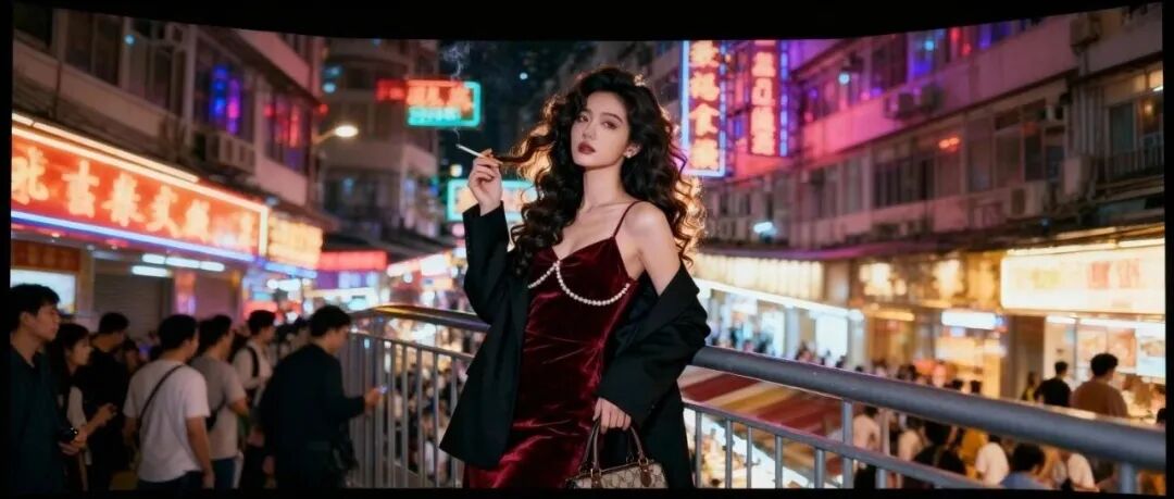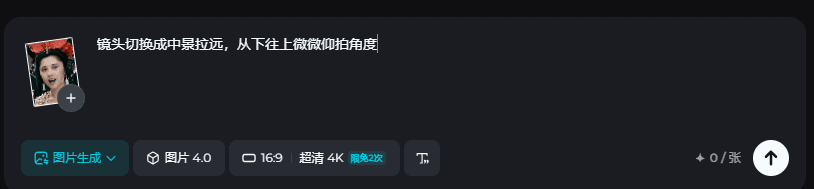 写上提示词:镜头切换成中景拉远,从下往上微微仰拍角度
